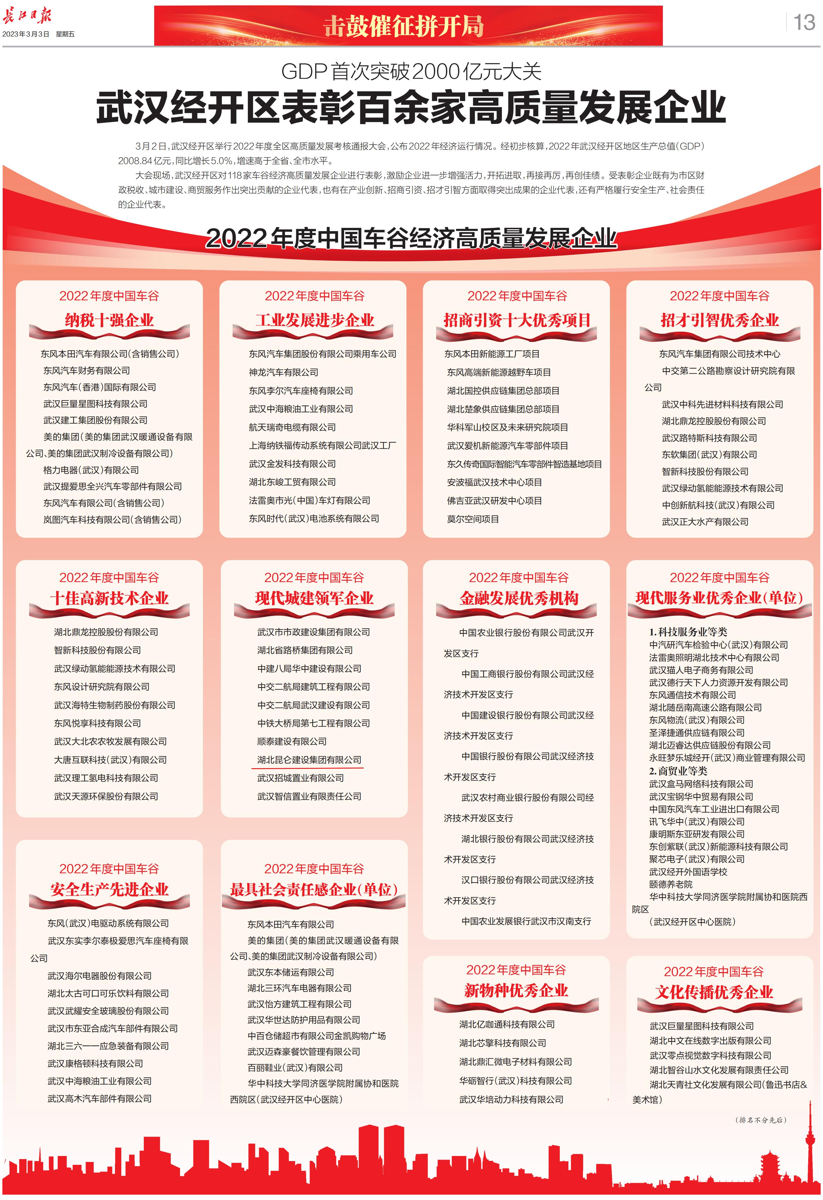 • 2022年昆侖集團榮登武漢經開區高質量發展企業(...